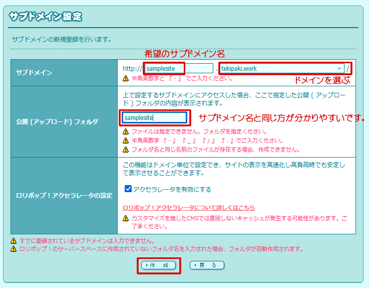 『samplesite.』がついた、サイトを作ります。
